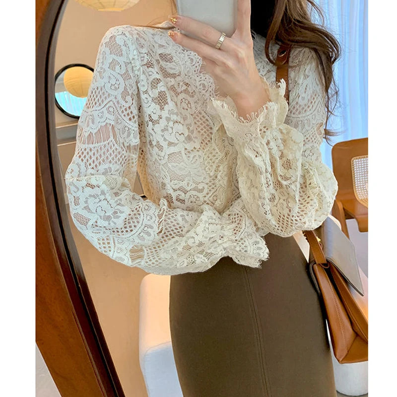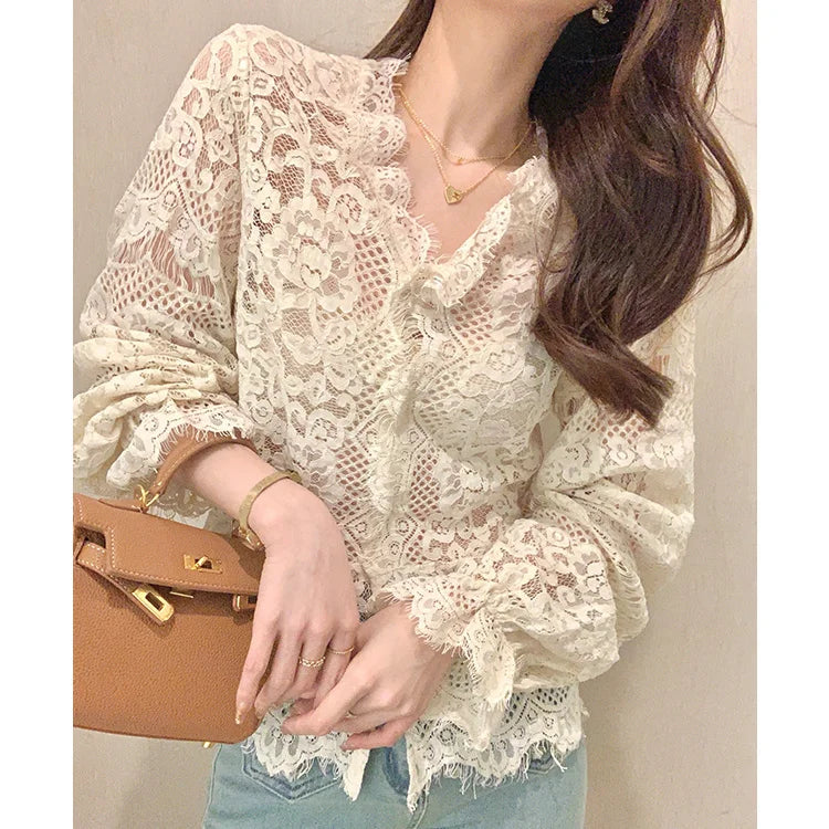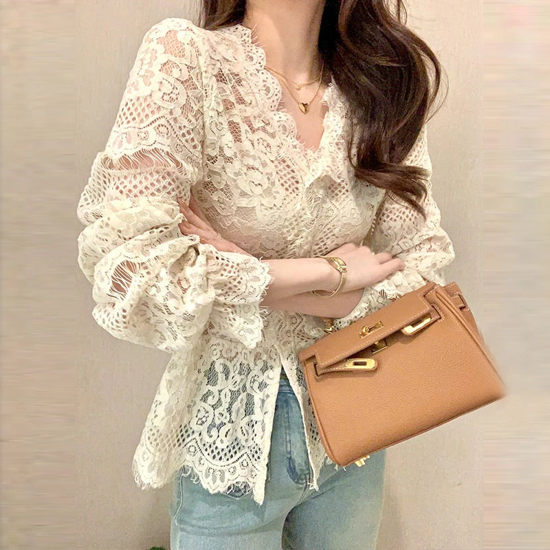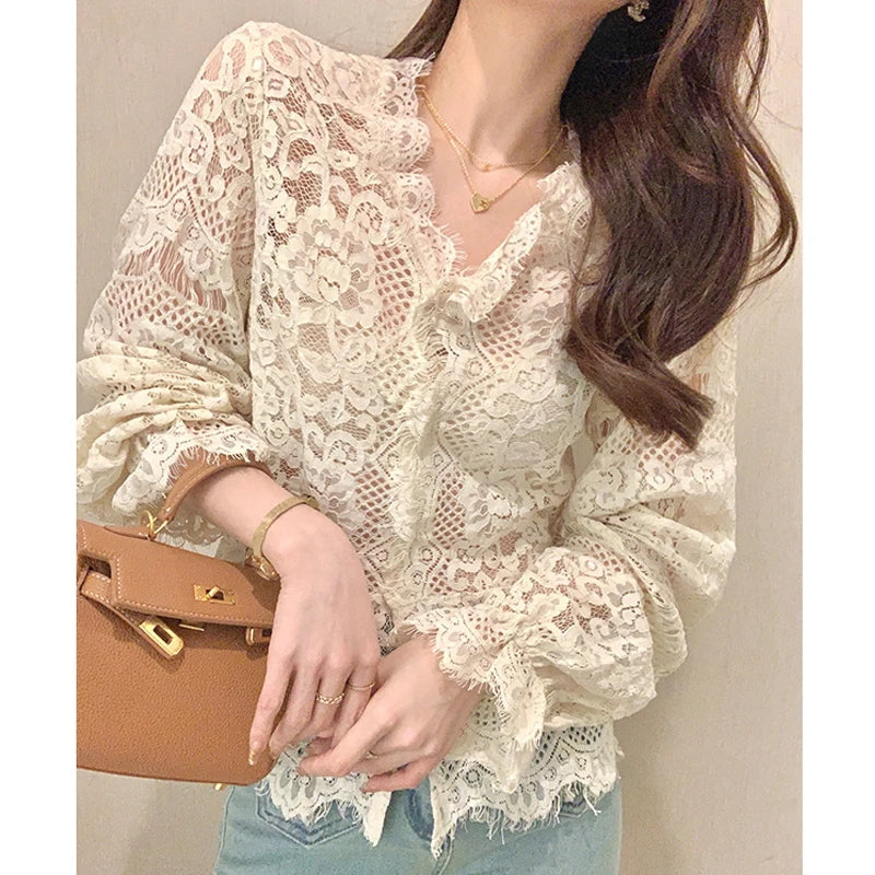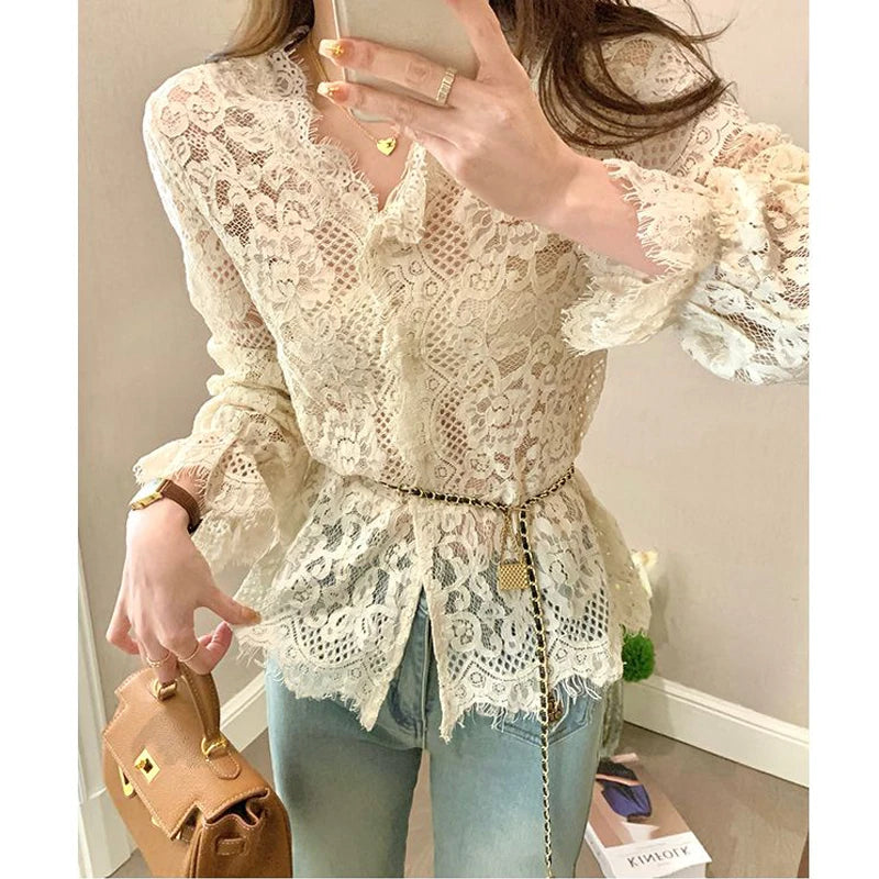 Women's Clothing 2024 Spring Autumn Sexy Hollow Out Lace Chic Vintage T-shirts Female Casual Solid V Neck Slim Long Sleeve Tops
