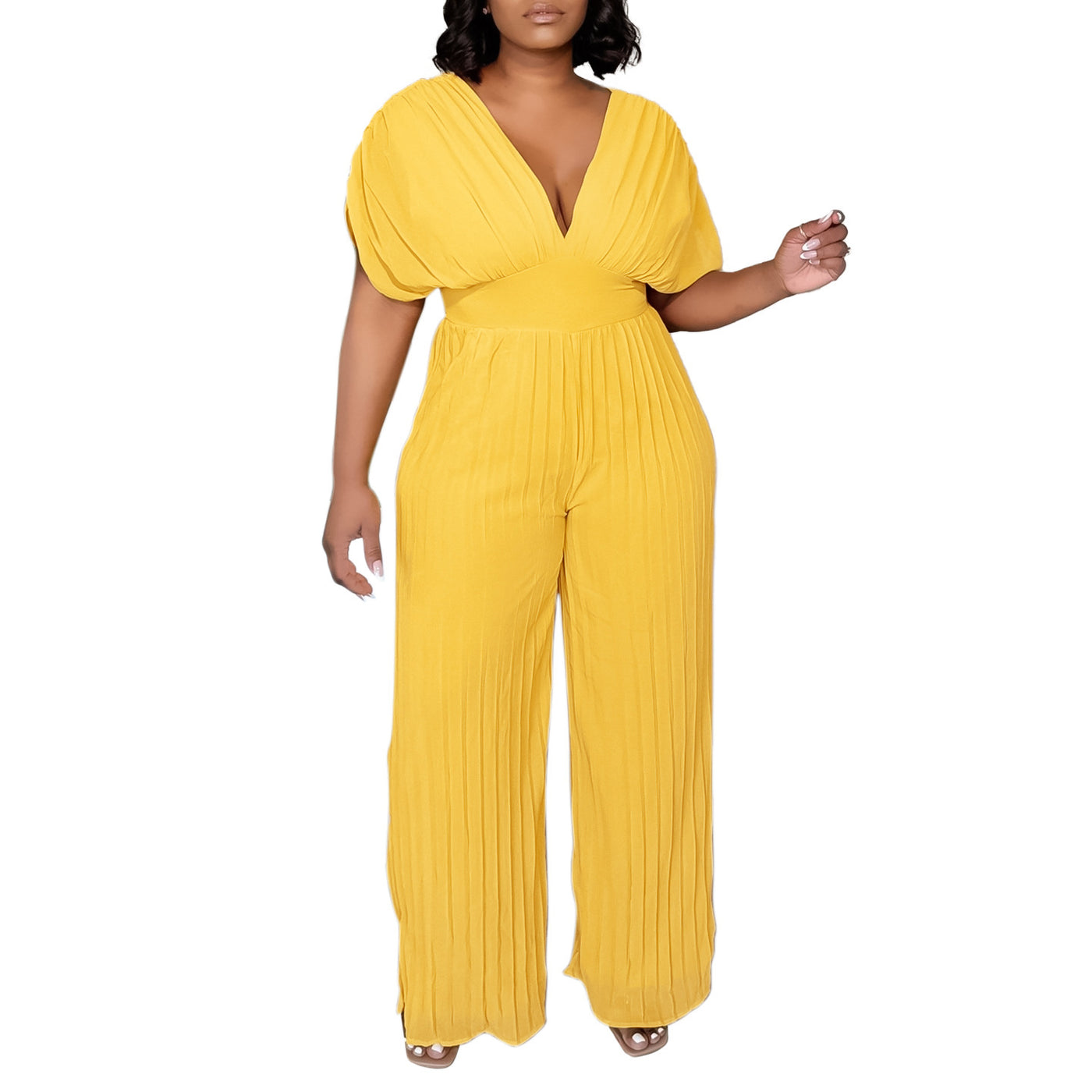 Women's V-neck Solid Color Pleated Jumpsuit